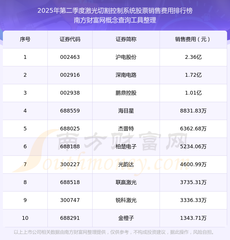 2025年第二季度激光切割控制系統(tǒng)股票銷售費(fèi)用排行榜如下:滬電股份(002463)的銷售費(fèi)用總額高達(dá)2.36億,深南電路(002916)和鵬鼎控股(002938)分別位居第二和第三,海目星(688559)、杰普特(688025)、柏楚電子(688188)、光韻達(dá)(300227)、聯(lián)贏激光(688518)、銳科激光(300747)、金橙子(688291)分別進(jìn)入前十,其銷售費(fèi)用總額分別排名第4-10名。