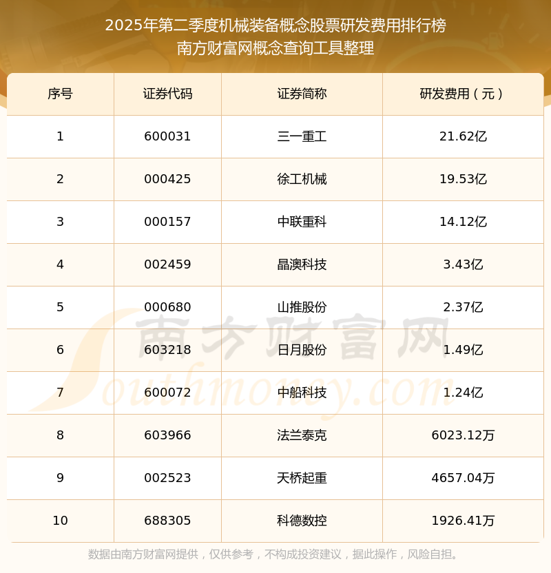 2025年第二季度機(jī)械裝備概念股票研發(fā)費用排行榜如下:三一重工(600031)研發(fā)費用總額高達(dá)21.62億,徐工機(jī)械(000425)和中聯(lián)重科(000157)分別排名第二和第三,晶澳科技(002459)、山推股份(000680)、日月股份(603218)、中船科技(600072)、法蘭泰克(603966)、天橋起重(002523)、科德數(shù)控(688305)分別進(jìn)入前十,其研發(fā)費用總額分別排名第4-10名。