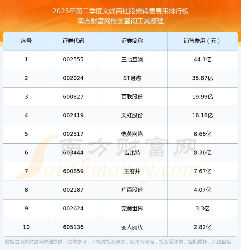 2025年第二季度文娛商社股票銷售費用排行榜如下:三七互娛(002555)的銷售費用總額高達44.1億,ST易購(002024)和百聯(lián)股份(600827)分別位居第二和第三,天虹股份(002419)、愷英網(wǎng)絡(luò)(002517)、吉比特(603444)、王府井(600859)、廣百股份(002187)、完美世界(002624)、麗人麗妝(605136)分別進入前十,其銷售費用總額分別排名第4-10名。