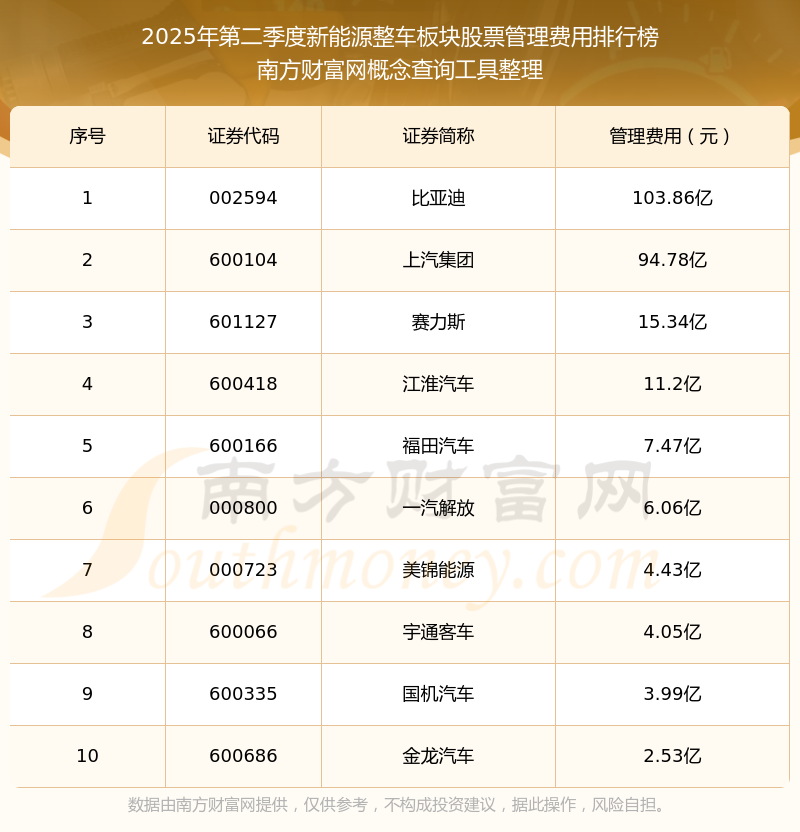 2025年第二季度,新能源整車板塊股票管理費(fèi)用排行榜中,比亞迪(002594)的管理費(fèi)用總額高達(dá)103.86億,上汽集團(tuán)(600104)和賽力斯(601127)分別位居第二和第三,江淮汽車(600418)、福田汽車(600166)、一汽解放(000800)、美錦能源(000723)、宇通客車(600066)、國(guó)機(jī)汽車(600335)、金龍汽車(600686)分別進(jìn)入前十,其管理費(fèi)用總額分別排名第4-10名。