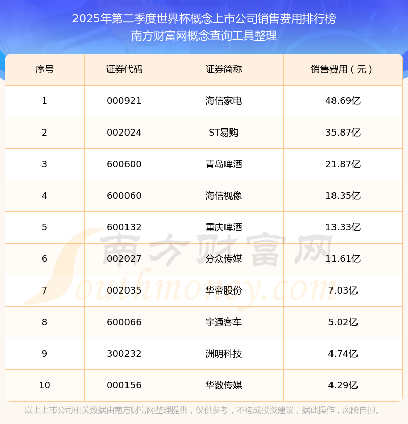 2025年第二季度,世界杯概念上市公司銷售費用排行榜如下:海信家電(000921)的銷售費用總額高達48.69億,ST易購(002024)和青島啤酒(600600)分別位居第二和第三,海信視像(600060)、重慶啤酒(600132)、分眾傳媒(002027)、華帝股份(002035)、宇通客車(600066)、洲明科技(300232)、華數(shù)傳媒(000156)分別進入前十,其銷售費用總額分別排名第4-10名。