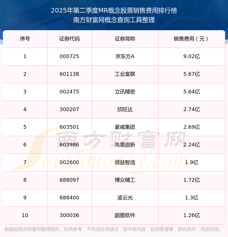 2025年第二季度,MR概念股票銷售費(fèi)用排行榜中,京東方A(000725)銷售費(fèi)用總額高達(dá)9.02億,工業(yè)富聯(lián)(601138)和立訊精密(002475)位居第二和第三,欣旺達(dá)(300207)、豪威集團(tuán)(603501)、兆易創(chuàng)新(603986)、領(lǐng)益智造(002600)、博眾精工(688097)、凌云光(688400)、超圖軟件(300036)進(jìn)入前十,銷售費(fèi)用總額分別排名第4-10名。