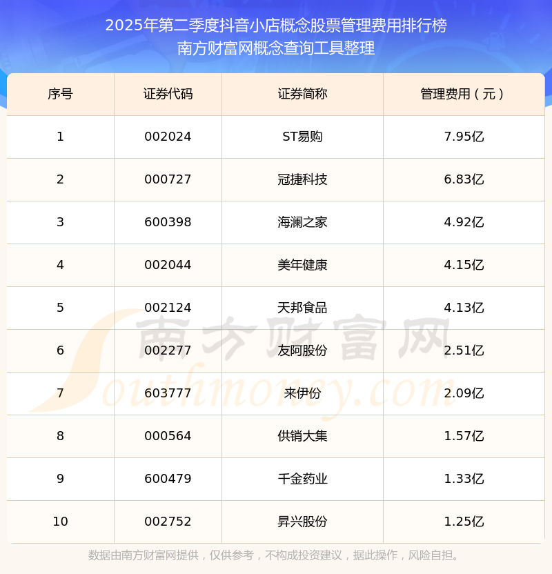 2025年第二季度,抖音小店概念股票管理費用排名如下:ST易購(002024)的管理費用總額高達7.95億,冠捷科技(000727)和海瀾之家(600398)位居第二和第三,美年健康(002044)、天邦食品(002124)、友阿股份(002277)、來伊份(603777)、供銷大集(000564)、千金藥業(yè)(600479)、昇興股份(002752)分別進入前十,其管理費用總額分別排名第4-10名。