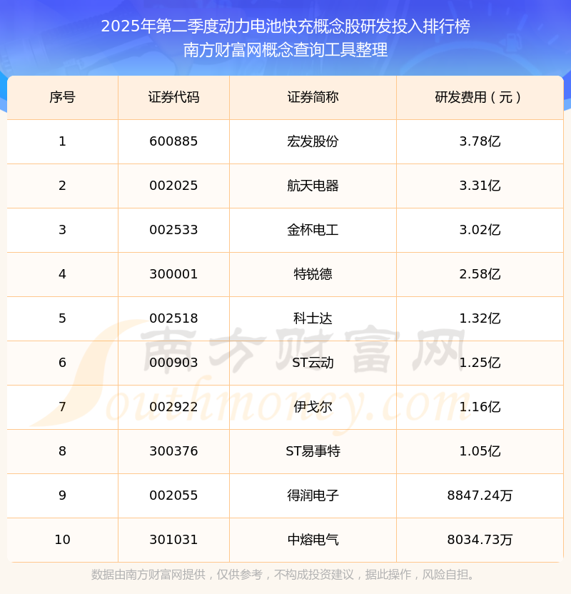 2025年第二季度動力電池快充概念股研發(fā)投入排行榜如下:宏發(fā)股份(600885)研發(fā)投入總額高達3.78億,航天電器(002025)和金杯電工(002533)分別位居第二和第三,特銳德(300001)、科士達(002518)、ST云動(000903)、伊戈爾(002922)、ST易事特(300376)、得潤電子(002055)、中熔電氣(301031)分別進入前十,其研發(fā)投入總額分別排名第4-10名。
