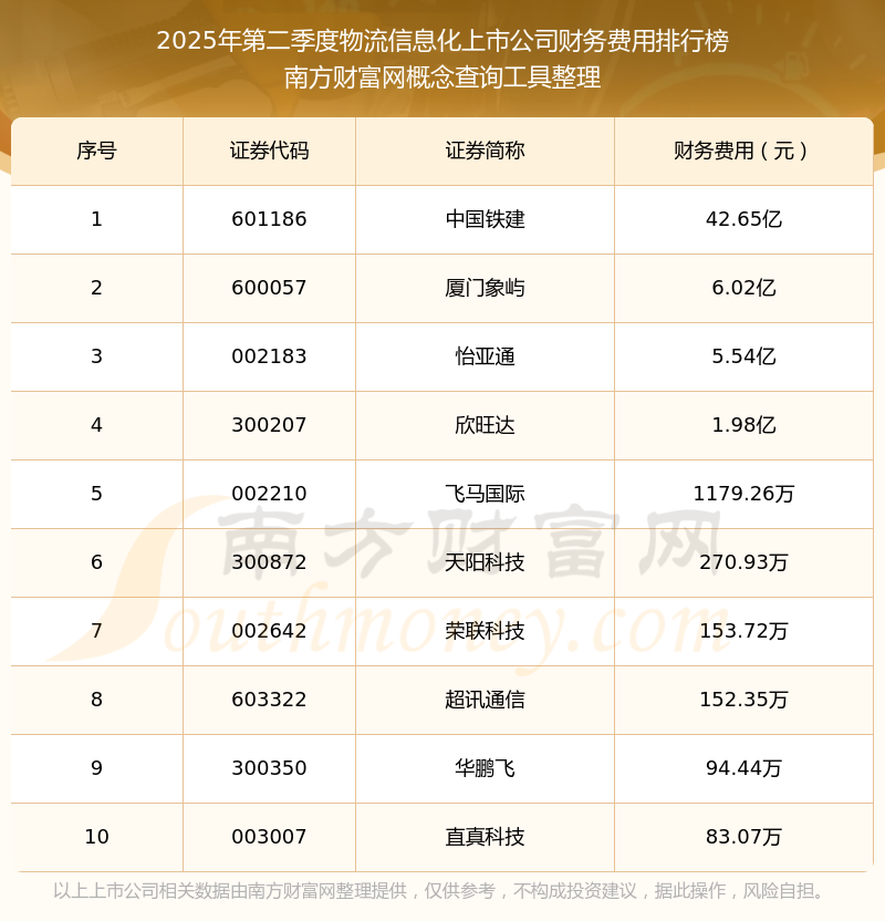 2025年第二季度物流信息化上市公司財務(wù)費用排行榜如下:中國鐵建(601186)的財務(wù)費用總額高達42.65億,廈門象嶼(600057)和怡亞通(002183)分別位居第二和第三,欣旺達(300207)、飛馬國際(002210)、天陽科技(300872)、榮聯(lián)科技(002642)、超訊通信(603322)、華鵬飛(300350)、直真科技(003007)分別進入前十,其財務(wù)費用總額分別排名第4-10名。