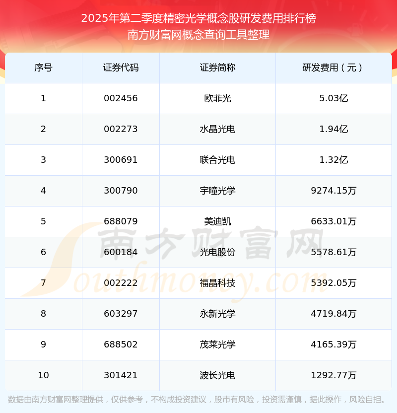 2025年第二季度,精密光學(xué)概念股研發(fā)費用排行榜中,歐菲光(002456)研發(fā)費用總額高達5.03億,水晶光電(002273)和聯(lián)合光電(300691)排名第二和第三,宇瞳光學(xué)(300790)、美迪凱(688079)、光電股份(600184)、福晶科技(002222)、永新光學(xué)(603297)、茂萊光學(xué)(688502)、波長光電(301421)進入前十,研發(fā)費用總額分別排名第4-10名。