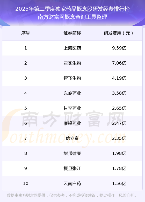 2025年第二季度,獨家藥品概念股研發(fā)經(jīng)費排行榜中,上海醫(yī)藥(601607)研發(fā)經(jīng)費總額高達9.59億,君實生物(688180)和智飛生物(300122)排名第二和第三,以嶺藥業(yè)(002603)、甘李藥業(yè)(603087)、康緣藥業(yè)(600557)、信立泰(002294)、華邦健康(002004)、復(fù)旦張江(688505)、云南白藥(000538)進入前十,研發(fā)經(jīng)費總額分別排名第4-10名。