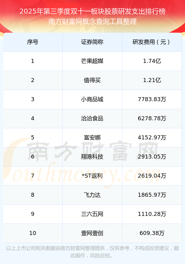 2025年第三季度雙十一板塊股票研發(fā)支出排行榜如下:芒果超媒(300413)研發(fā)支出總額高達1.74億,值得買(300785)和小商品城(600415)分別位居第二和第三,洽洽食品(002557)、富安娜(002327)、翔港科技(603499)、*ST返利(600228)、飛力達(300240)、三六五網(wǎng)(300295)、壹網(wǎng)壹創(chuàng)(300792)分別進入前十,其研發(fā)支出總額分別排名第4-10名。