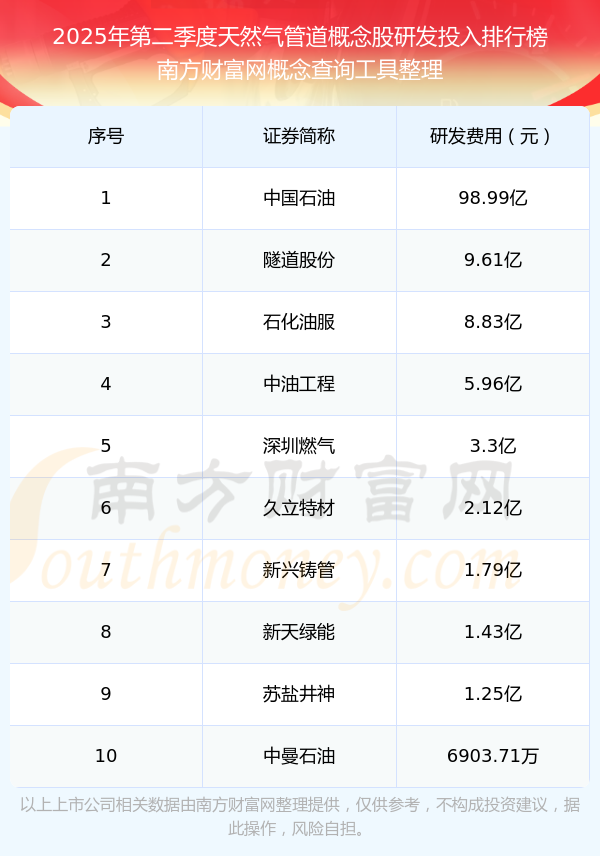2025年第二季度,天然氣管道概念股研發(fā)投入排行榜中,中國石油(601857)研發(fā)投入總額高達(dá)98.99億,隧道股份(600820)和石化油服(600871)排名第二和第三,中油工程(600339)、深圳燃?xì)猓?01139)、久立特材(002318)、新興鑄管(000778)、新天綠能(600956)、蘇鹽井神(603299)、中曼石油(603619)進(jìn)入前十,研發(fā)投入總額分別排名第4-10名。
