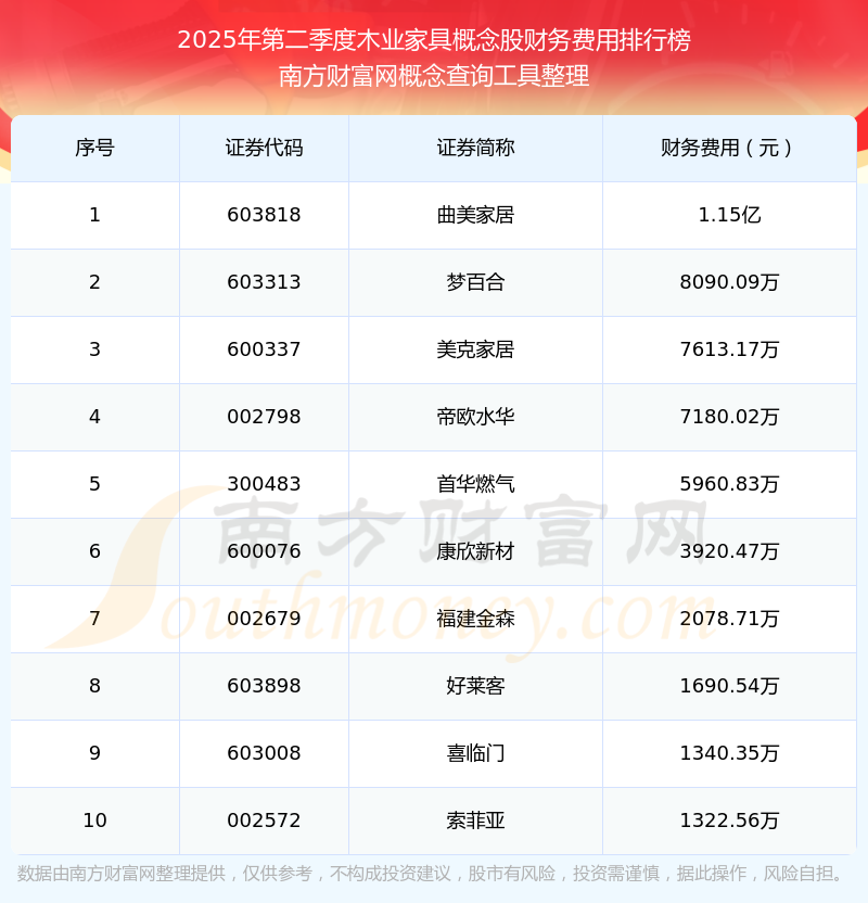 2025年第二季度,木業(yè)家具概念股財(cái)務(wù)費(fèi)用排名如下:曲美家居(603818)的財(cái)務(wù)費(fèi)用總額高達(dá)1.15億,夢(mèng)百合(603313)和美克家居(600337)分別位居第二和第三,帝歐水華(002798)、首華燃?xì)猓?00483)、康欣新材(600076)、福建金森(002679)、好萊客(603898)、喜臨門(603008)、索菲亞(002572)分別進(jìn)入前十,其財(cái)務(wù)費(fèi)用總額分別排名第4-10名。