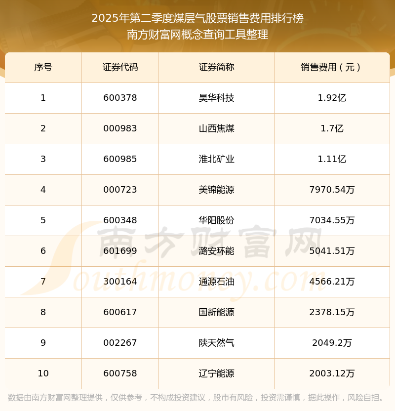 2025年第二季度,煤層氣股票銷售費用排行榜中,昊華科技(600378)銷售費用總額高達1.92億,山西焦煤(000983)和淮北礦業(yè)(600985)位居第二和第三,美錦能源(000723)、華陽股份(600348)、潞安環(huán)能(601699)、通源石油(300164)、國新能源(600617)、陜天然氣(002267)、遼寧能源(600758)進入前十,銷售費用總額分別排名第4-10名。