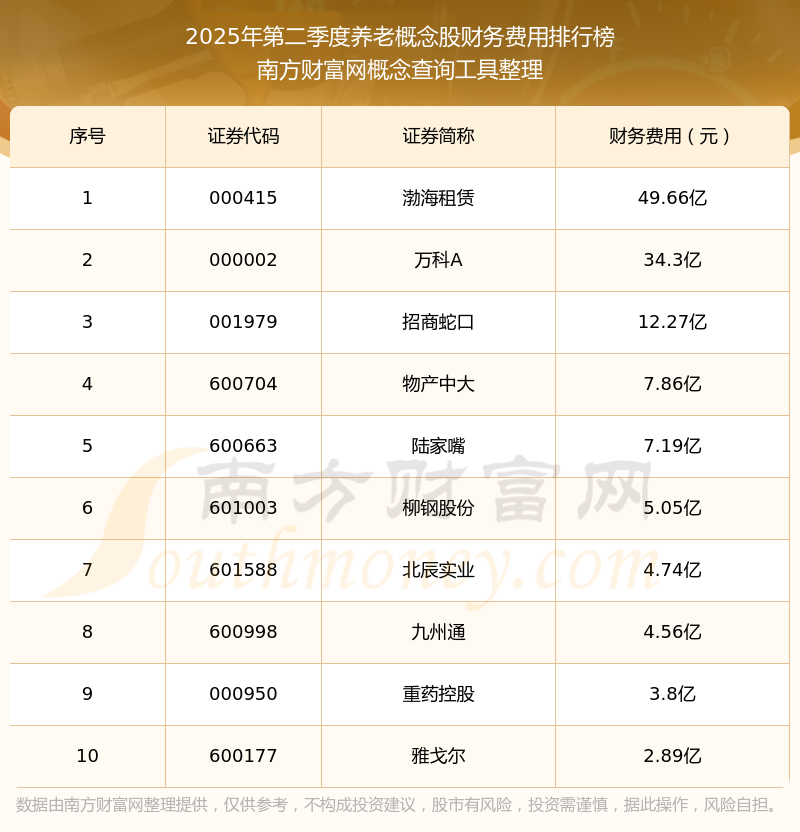2025年第二季度,養(yǎng)老概念概念股財(cái)務(wù)費(fèi)用排行榜中,渤海租賃(000415)財(cái)務(wù)費(fèi)用總額高達(dá)49.66億,萬(wàn)科A(000002)和招商蛇口(001979)位居第二和第三,物產(chǎn)中大(600704)、陸家嘴(600663)、柳鋼股份(601003)、北辰實(shí)業(yè)(601588)、九州通(600998)、重藥控股(000950)、雅戈?duì)枺?00177)進(jìn)入前十,財(cái)務(wù)費(fèi)用總額分別排名第4-10名。