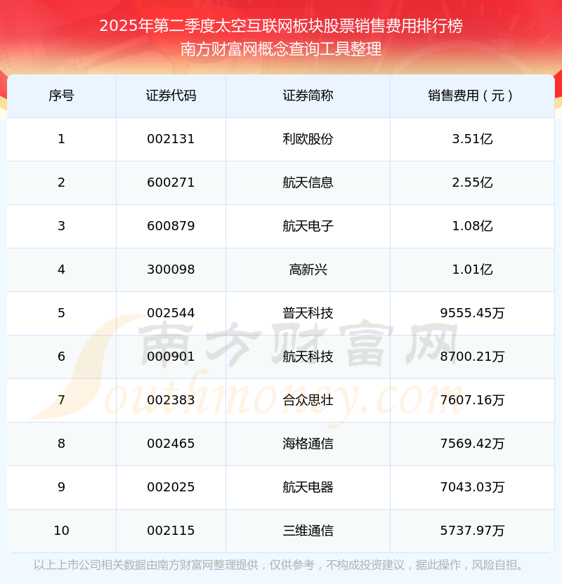 2025年第二季度太空互聯(lián)網(wǎng)板塊股票銷售費(fèi)用排行榜如下:利歐股份(002131)的銷售費(fèi)用總額高達(dá)3.51億,航天信息(600271)和航天電子(600879)分別位居第二和第三,高新興(300098)、普天科技(002544)、航天科技(000901)、合眾思?jí)眩?02383)、海格通信(002465)、航天電器(002025)、三維通信(002115)分別進(jìn)入前十,其銷售費(fèi)用總額分別排名第4-10名。