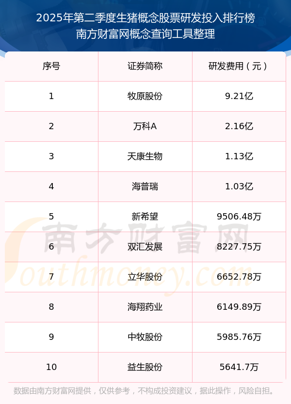 2025年第二季度生豬概念股票研發(fā)投入排行榜如下:牧原股份(002714)研發(fā)投入總額高達(dá)9.21億,萬科A(000002)和天康生物(002100)分別排名第二和第三,海普瑞(002399)、新希望(000876)、雙匯發(fā)展(000895)、立華股份(300761)、海翔藥業(yè)(002099)、中牧股份(600195)、益生股份(002458)分別進(jìn)入前十,其研發(fā)投入總額分別排名第4-10名。