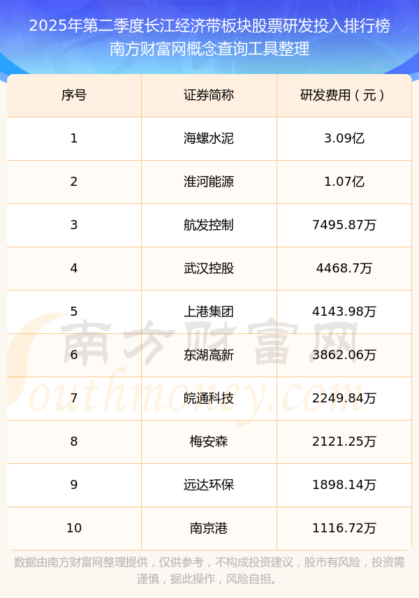 2025年第二季度,長江經(jīng)濟帶板塊股票研發(fā)投入排行榜中,海螺水泥(600585)研發(fā)投入總額高達3.09億,淮河能源(600575)和航發(fā)控制(000738)排名第二和第三,武漢控股(600168)、上港集團(600018)、東湖高新(600133)、皖通科技(002331)、梅安森(300275)、遠達環(huán)保(600292)、南京港(002040)進入前十,研發(fā)投入總額分別排名第4-10名。