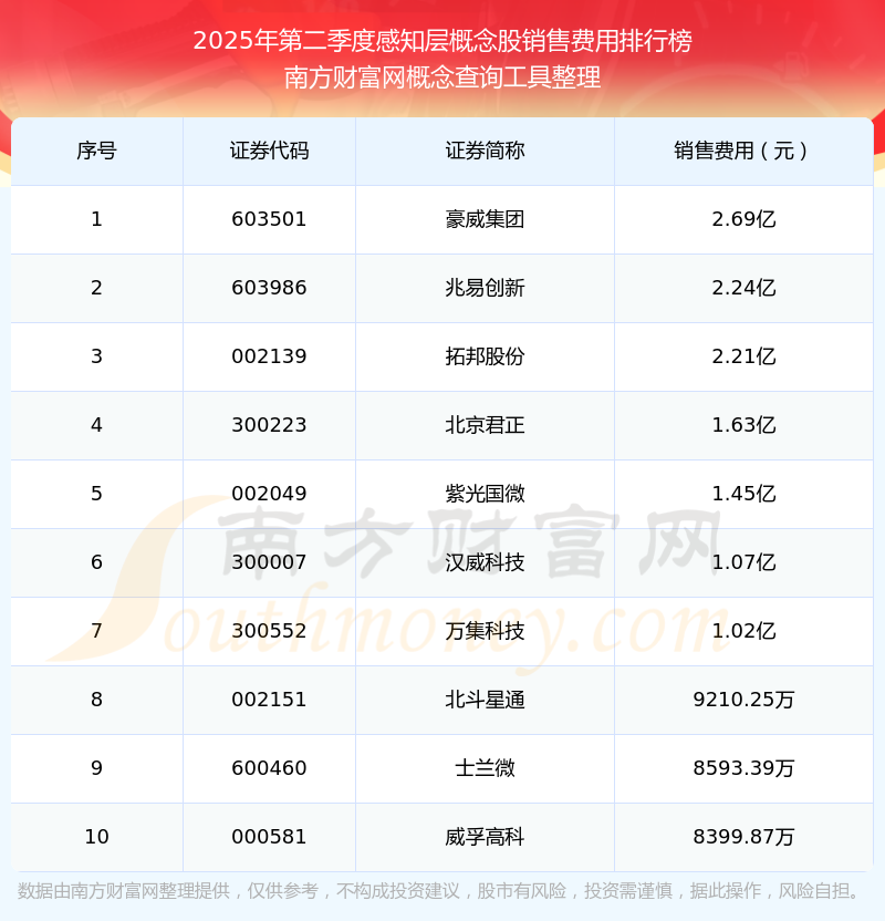 2025年第二季度,感知層概念股銷售費(fèi)用排行榜如下:豪威集團(tuán)(603501)的銷售費(fèi)用總額高達(dá)2.69億,兆易創(chuàng)新(603986)和拓邦股份(002139)分別位居第二和第三,北京君正(300223)、紫光國(guó)微(002049)、漢威科技(300007)、萬(wàn)集科技(300552)、北斗星通(002151)、士蘭微(600460)、威孚高科(000581)分別進(jìn)入前十,其銷售費(fèi)用總額分別排名第4-10名。