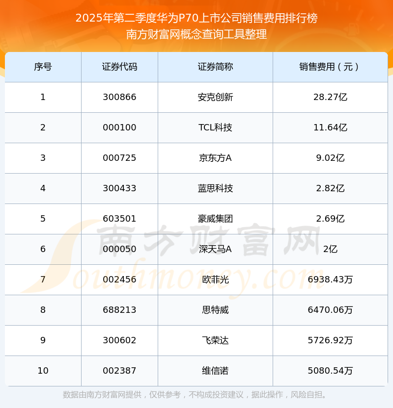 2025年第二季度華為P70上市公司銷(xiāo)售費(fèi)用排行榜如下:安克創(chuàng)新(300866)的銷(xiāo)售費(fèi)用總額高達(dá)28.27億,TCL科技(000100)和京東方A(000725)分別位居第二和第三,藍(lán)思科技(300433)、豪威集團(tuán)(603501)、深天馬A(000050)、歐菲光(002456)、思特威(688213)、飛榮達(dá)(300602)、維信諾(002387)分別進(jìn)入前十,其銷(xiāo)售費(fèi)用總額分別排名第4-10名。