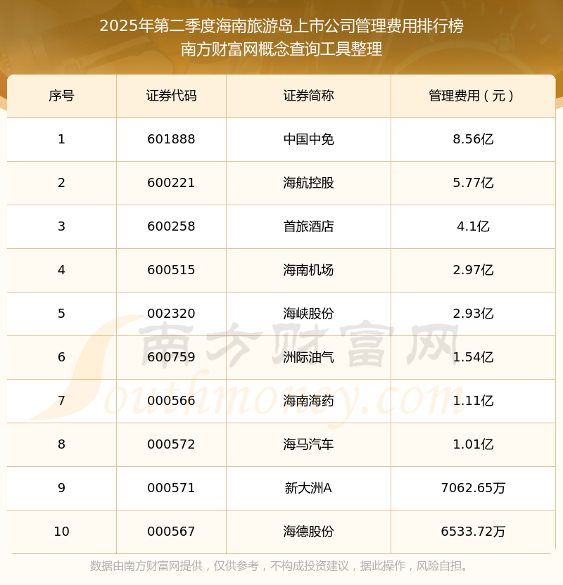 2025年第二季度,海南旅游島上市公司管理費用排行榜如下:中國中免(601888)的管理費用總額高達8.56億,海航控股(600221)和首旅酒店(600258)分別排名第二和第三,海南機場(600515)、海峽股份(002320)、洲際油氣(600759)、海南海藥(000566)、海馬汽車(000572)、新大洲A(000571)、海德股份(000567)分別進入前十,其管理費用總額分別排名第4-10名。