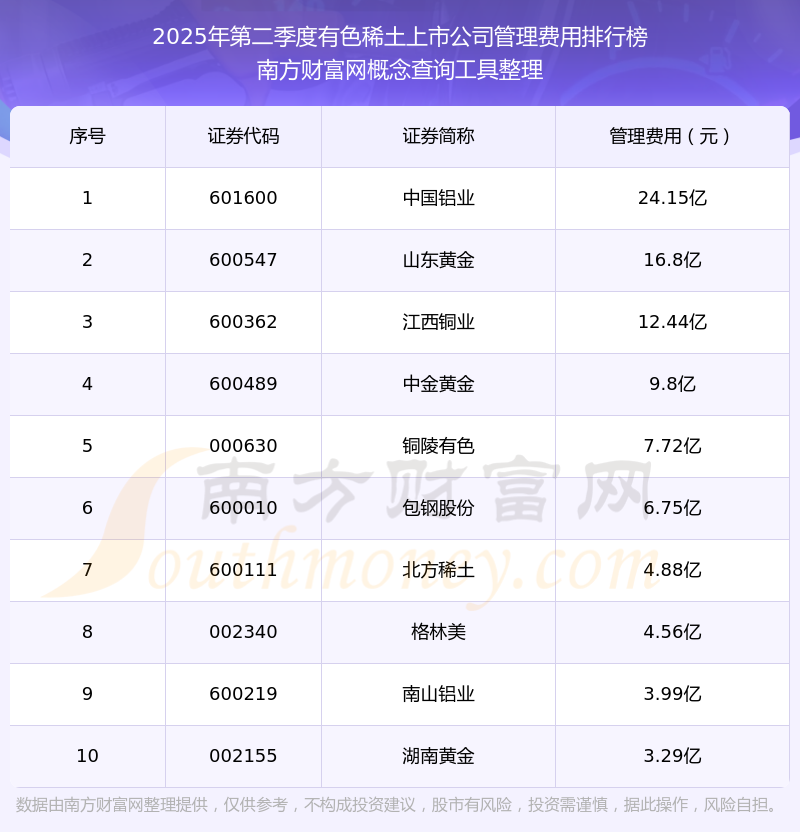 2025年第二季度,有色稀土上市公司管理費(fèi)用排名中,中國(guó)鋁業(yè)(601600)的管理費(fèi)用總額高達(dá)24.15億,山東黃金(600547)和江西銅業(yè)(600362)排名第二和第三,中金黃金(600489)、銅陵有色(000630)、包鋼股份(600010)、北方稀土(600111)、格林美(002340)、南山鋁業(yè)(600219)、湖南黃金(002155)進(jìn)入前十,其管理費(fèi)用總額分別排名第4-10名。