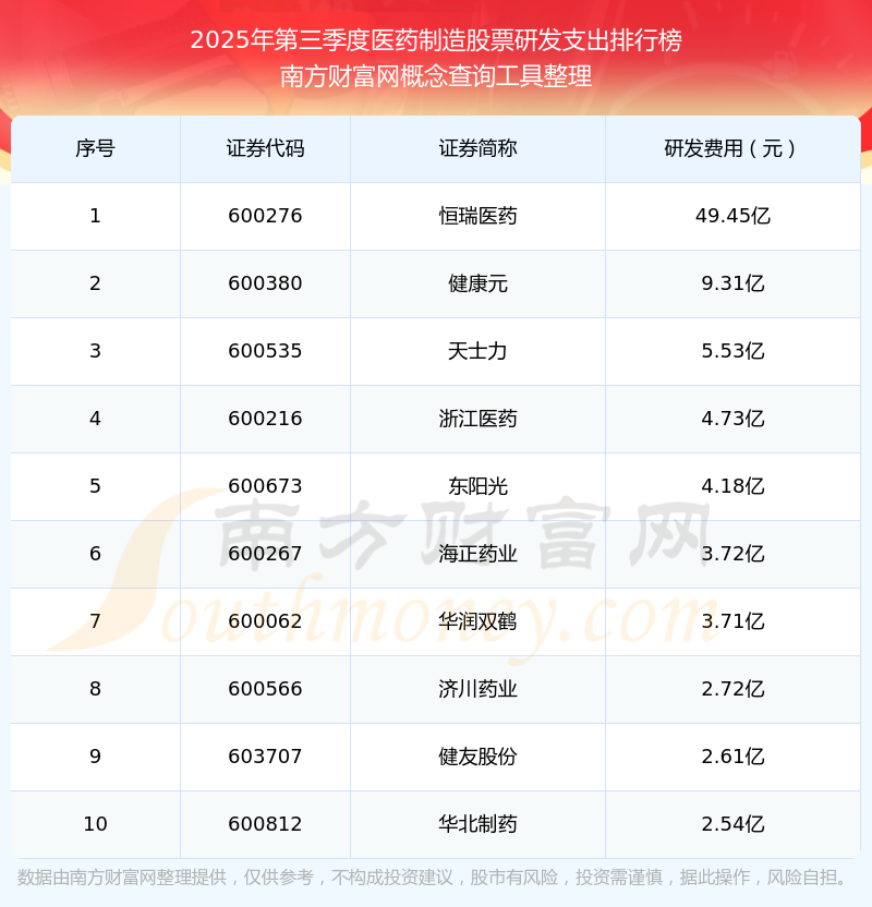 2025年第三季度醫(yī)藥制造股票研發(fā)支出排行榜如下:恒瑞醫(yī)藥(600276)研發(fā)支出總額高達49.45億,健康元(600380)和天士力(600535)分別排名第二和第三,浙江醫(yī)藥(600216)、東陽光(600673)、海正藥業(yè)(600267)、華潤雙鶴(600062)、濟川藥業(yè)(600566)、健友股份(603707)、華北制藥(600812)分別進入前十,其研發(fā)支出總額分別排名第4-10名。