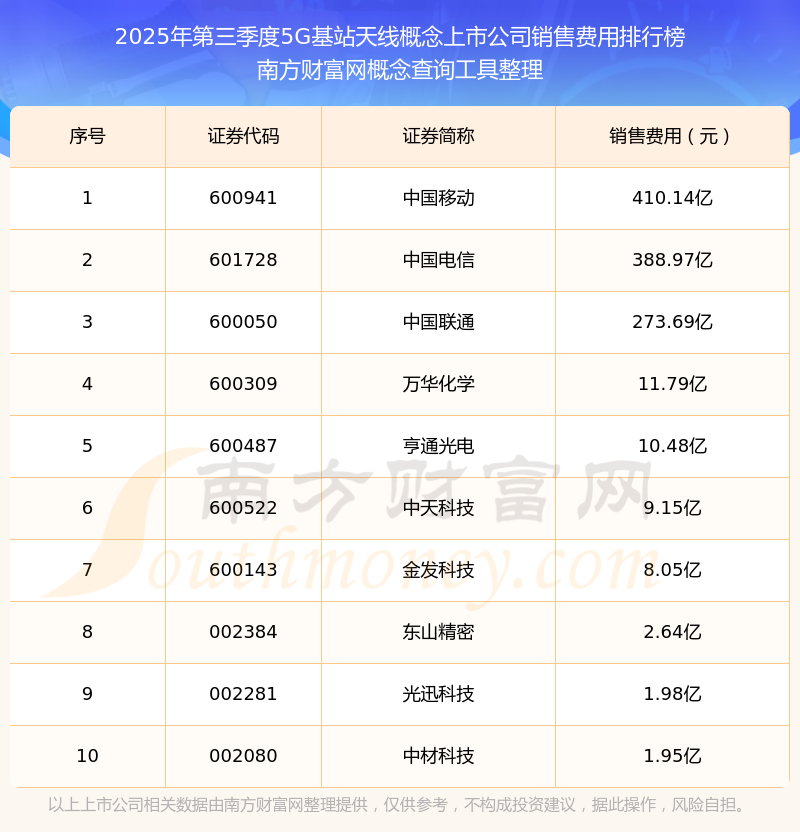 2025年第三季度,5G基站天線概念上市公司銷售費(fèi)用排行榜中,中國移動(600941)銷售費(fèi)用總額高達(dá)410.14億,中國電信(601728)和中國聯(lián)通(600050)位居第二和第三,萬華化學(xué)(600309)、亨通光電(600487)、中天科技(600522)、金發(fā)科技(600143)、東山精密(002384)、光迅科技(002281)、中材科技(002080)進(jìn)入前十,銷售費(fèi)用總額分別排名第4-10名。
