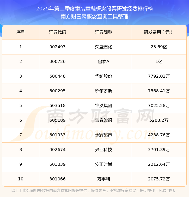 2025年第二季度童裝童鞋概念股票研發(fā)經(jīng)費(fèi)排行榜如下:榮盛石化(002493)研發(fā)經(jīng)費(fèi)總額高達(dá)23.69億,魯泰A(000726)和華紡股份(600448)分別位居第二和第三,鄂爾多斯(600295)、錦泓集團(tuán)(603518)、富春染織(605189)、永輝超市(601933)、興業(yè)科技(002674)、安正時(shí)尚(603839)、萬(wàn)事利(301066)分別進(jìn)入前十,其研發(fā)經(jīng)費(fèi)總額分別排名第4-10名。