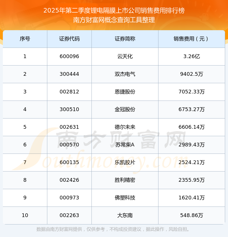 2025年第二季度,鋰電隔膜上市公司銷售費用排行榜如下:云天化(600096)的銷售費用總額高達(dá)3.26億,雙杰電氣(300444)和恩捷股份(002812)分別排名第二和第三,金冠股份(300510)、德爾未來(002631)、蘇常柴A(000570)、樂凱膠片(600135)、勝利精密(002426)、佛塑科技(000973)、大東南(002263)分別進(jìn)入前十,其銷售費用總額分別排名第4-10名。