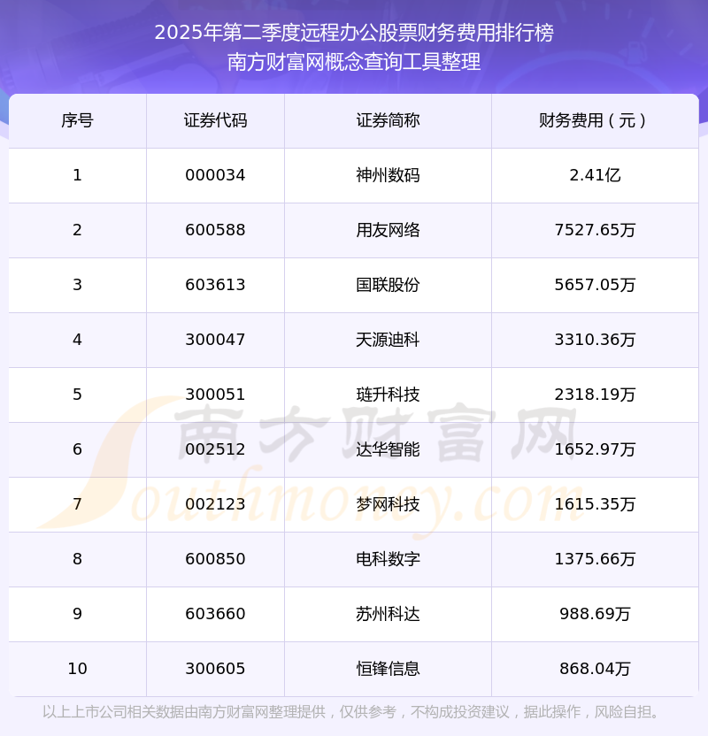 2025年第二季度,遠(yuǎn)程辦公股票財(cái)務(wù)費(fèi)用排行榜中,神州數(shù)碼(000034)財(cái)務(wù)費(fèi)用總額高達(dá)2.41億,用友網(wǎng)絡(luò)(600588)和國(guó)聯(lián)股份(603613)位居第二和第三,天源迪科(300047)、璉升科技(300051)、達(dá)華智能(002512)、夢(mèng)網(wǎng)科技(002123)、電科數(shù)字(600850)、蘇州科達(dá)(603660)、恒鋒信息(300605)進(jìn)入前十,財(cái)務(wù)費(fèi)用總額分別排名第4-10名。