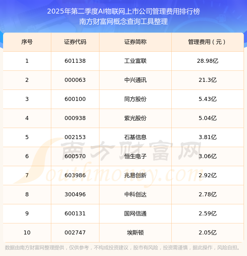 2025年第二季度,AI物聯(lián)網(wǎng)上市公司管理費(fèi)用排行榜如下:工業(yè)富聯(lián)(601138)的管理費(fèi)用總額高達(dá)28.98億,中興通訊(000063)和同方股份(600100)分別排名第二和第三,紫光股份(000938)、石基信息(002153)、恒生電子(600570)、兆易創(chuàng)新(603986)、中科創(chuàng)達(dá)(300496)、國(guó)網(wǎng)信通(600131)、埃斯頓(002747)分別進(jìn)入前十,其管理費(fèi)用總額分別排名第4-10名。