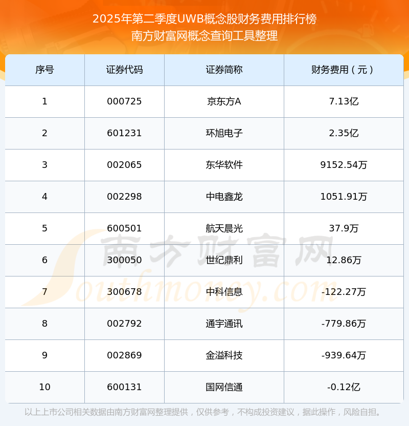 2025年第二季度,UWB概念概念股財務(wù)費(fèi)用排行榜中,京東方A(000725)財務(wù)費(fèi)用總額高達(dá)7.13億,環(huán)旭電子(601231)和東華軟件(002065)排名第二和第三,中電鑫龍(002298)、航天晨光(600501)、世紀(jì)鼎利(300050)、中科信息(300678)、通宇通訊(002792)、金溢科技(002869)、國網(wǎng)信通(600131)進(jìn)入前十,財務(wù)費(fèi)用總額分別排名第4-10名。