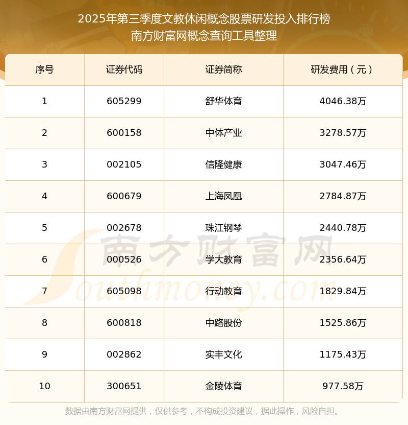 2025年第三季度文教休閑概念股票研發(fā)投入排行榜如下:舒華體育(605299)研發(fā)投入總額高達(dá)4046.38萬,中體產(chǎn)業(yè)(600158)和信隆健康(002105)分別位居第二和第三,上海鳳凰(600679)、珠江鋼琴(002678)、學(xué)大教育(000526)、行動教育(605098)、中路股份(600818)、實豐文化(002862)、金陵體育(300651)分別進(jìn)入前十,其研發(fā)投入總額分別排名第4-10名。