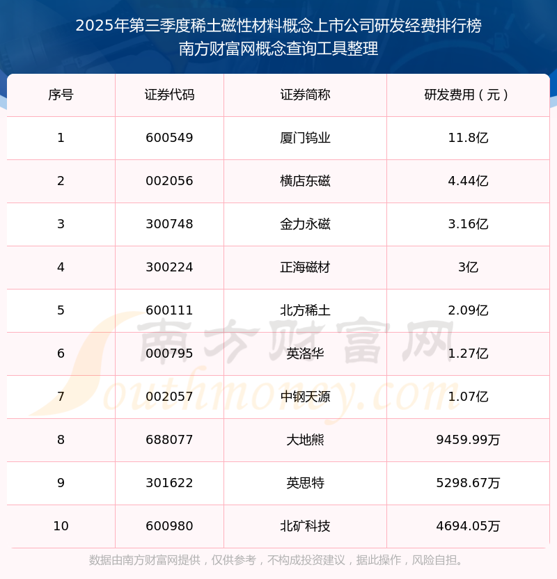 2025年第三季度稀土磁性材料概念上市公司研發(fā)經(jīng)費(fèi)排行榜如下:廈門鎢業(yè)(600549)研發(fā)經(jīng)費(fèi)總額高達(dá)11.8億,橫店東磁(002056)和金力永磁(300748)分別位居第二和第三,正海磁材(300224)、北方稀土(600111)、英洛華(000795)、中鋼天源(002057)、大地熊(688077)、英思特(301622)、北礦科技(600980)分別進(jìn)入前十,其研發(fā)經(jīng)費(fèi)總額分別排名第4-10名。