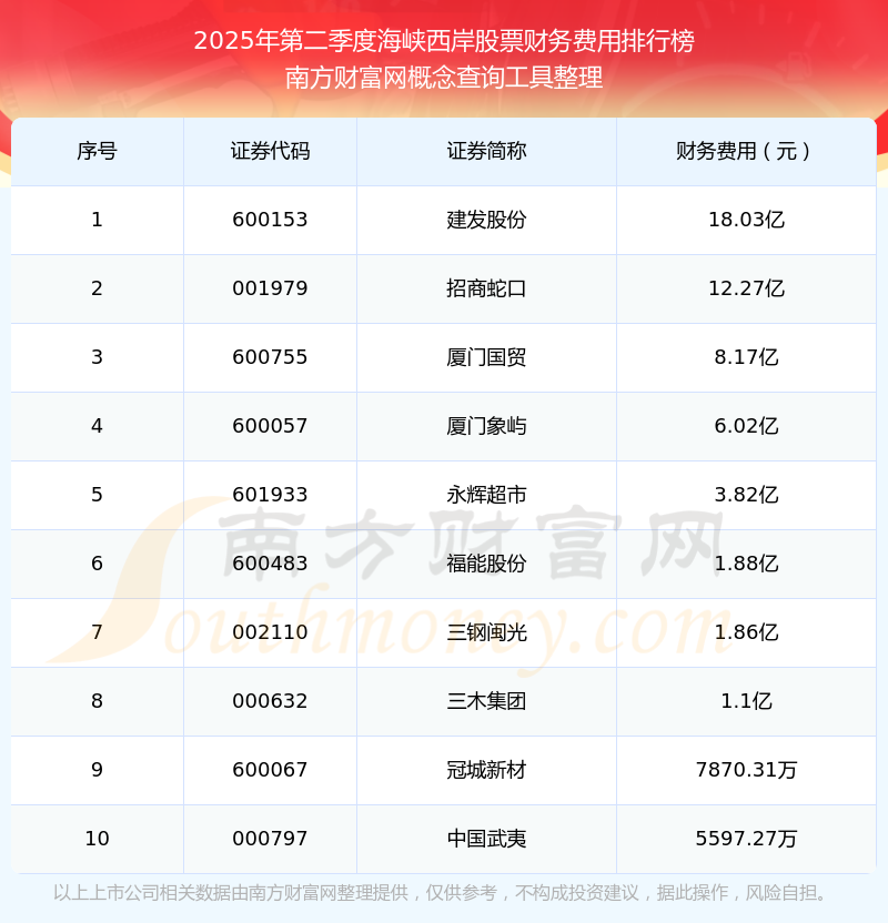 2025年第二季度,海峽西岸股票財務(wù)費用排行榜中,建發(fā)股份(600153)財務(wù)費用總額高達18.03億,招商蛇口(001979)和廈門國貿(mào)(600755)排名第二和第三,廈門象嶼(600057)、永輝超市(601933)、福能股份(600483)、三鋼閩光(002110)、三木集團(000632)、冠城新材(600067)、中國武夷(000797)進入前十,財務(wù)費用總額分別排名第4-10名。