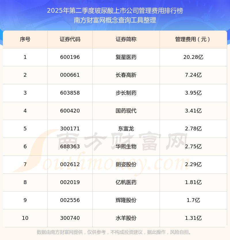 2025年第二季度,玻尿酸上市公司管理費(fèi)用排行榜如下:復(fù)星醫(yī)藥(600196)的管理費(fèi)用總額高達(dá)20.28億,長(zhǎng)春高新(000661)和步長(zhǎng)制藥(603858)分別排名第二和第三,國(guó)藥現(xiàn)代(600420)、東富龍(300171)、華熙生物(688363)、朗姿股份(002612)、億帆醫(yī)藥(002019)、輝隆股份(002556)、水羊股份(300740)分別進(jìn)入前十,其管理費(fèi)用總額分別排名第4-10名。