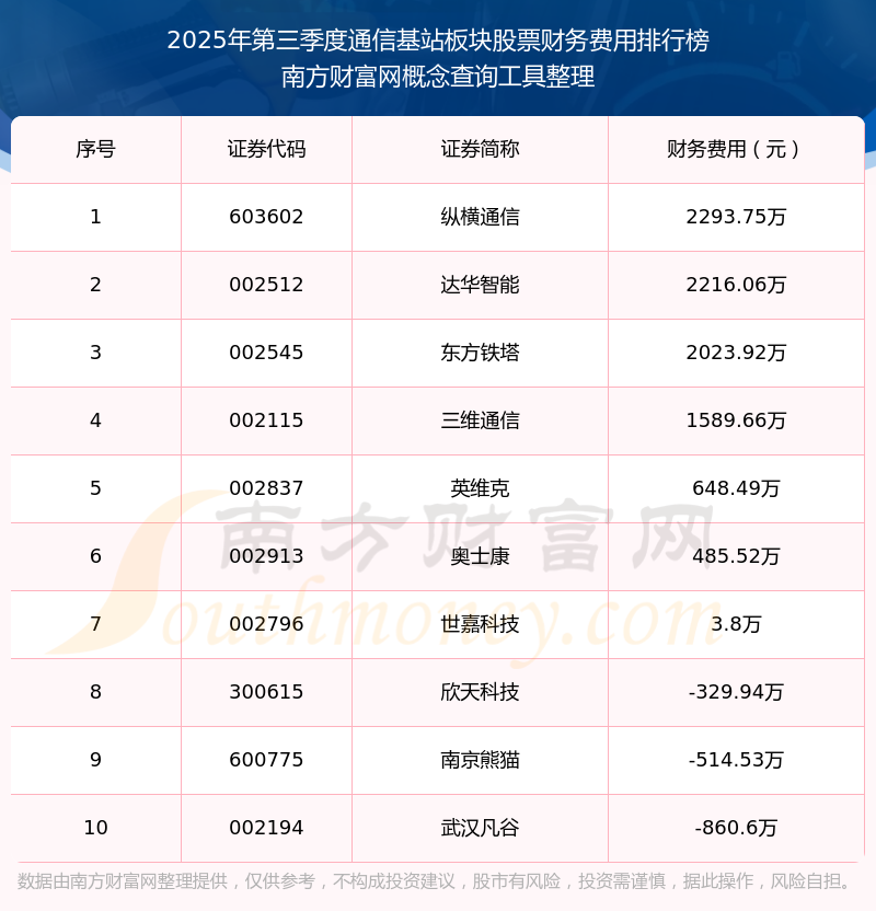 2025年第三季度,通信基站板塊股票財(cái)務(wù)費(fèi)用排行榜中,縱橫通信(603602)財(cái)務(wù)費(fèi)用總額高達(dá)2293.75萬,達(dá)華智能(002512)和東方鐵塔(002545)位居第二和第三,三維通信(002115)、英維克(002837)、奧士康(002913)、世嘉科技(002796)、欣天科技(300615)、南京熊貓(600775)、武漢凡谷(002194)進(jìn)入前十,財(cái)務(wù)費(fèi)用總額分別排名第4-10名。