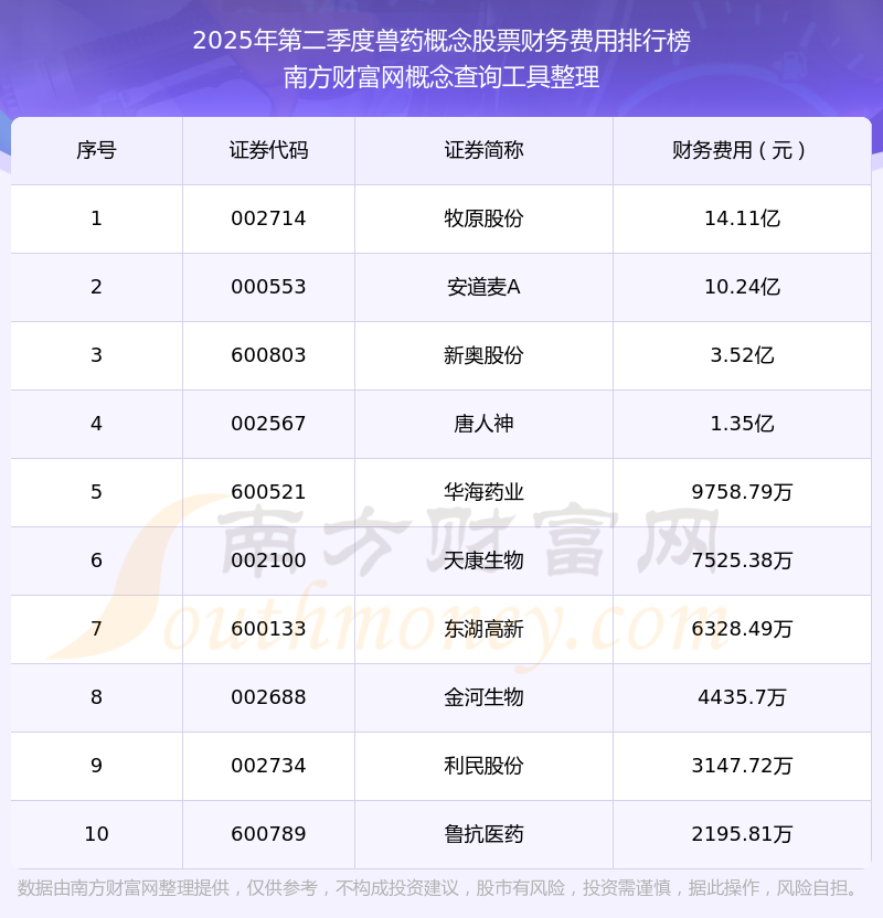 2025年第二季度獸藥概念股票財(cái)務(wù)費(fèi)用排行榜如下:牧原股份(002714)的財(cái)務(wù)費(fèi)用總額高達(dá)14.11億,安道麥A(000553)和新奧股份(600803)分別位居第二和第三,唐人神(002567)、華海藥業(yè)(600521)、天康生物(002100)、東湖高新(600133)、金河生物(002688)、利民股份(002734)、魯抗醫(yī)藥(600789)分別進(jìn)入前十,其財(cái)務(wù)費(fèi)用總額分別排名第4-10名。