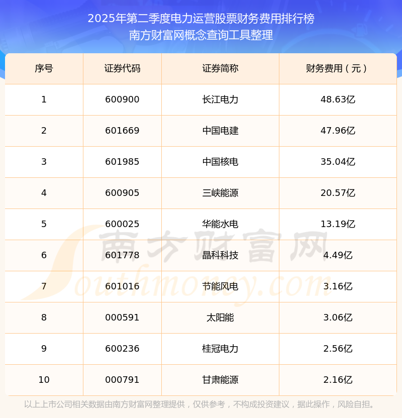 2025年第二季度電力運營股票財務(wù)費用排行榜如下:長江電力(600900)的財務(wù)費用總額高達48.63億,中國電建(601669)和中國核電(601985)分別排名第二和第三,三峽能源(600905)、華能水電(600025)、晶科科技(601778)、節(jié)能風電(601016)、太陽能(000591)、桂冠電力(600236)、甘肅能源(000791)分別進入前十,其財務(wù)費用總額分別排名第4-10名。