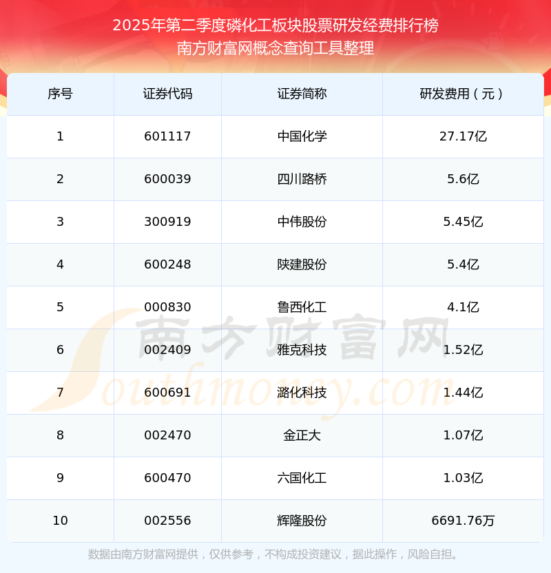 2025年第二季度磷化工板塊股票研發(fā)經(jīng)費排行榜如下:中國化學(601117)研發(fā)經(jīng)費總額高達27.17億,四川路橋(600039)和中偉股份(300919)分別排名第二和第三,陜建股份(600248)、魯西化工(000830)、雅克科技(002409)、潞化科技(600691)、金正大(002470)、六國化工(600470)、輝隆股份(002556)分別進入前十,其研發(fā)經(jīng)費總額分別排名第4-10名。