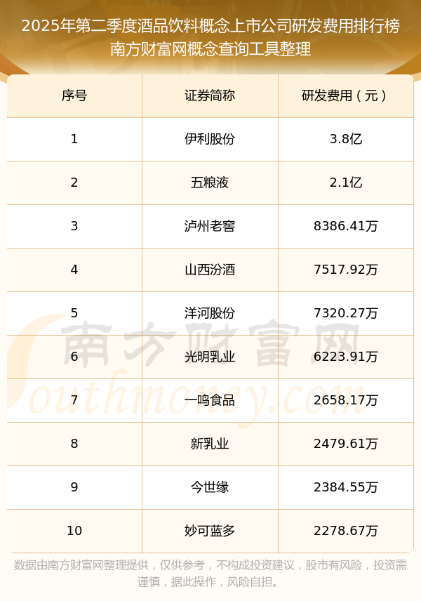 2025年第二季度酒品飲料概念上市公司研發(fā)費(fèi)用排行榜如下:伊利股份(600887)研發(fā)費(fèi)用總額高達(dá)3.8億,五糧液(000858)和瀘州老窖(000568)分別位居第二和第三,山西汾酒(600809)、洋河股份(002304)、光明乳業(yè)(600597)、一鳴食品(605179)、新乳業(yè)(002946)、今世緣(603369)、妙可藍(lán)多(600882)分別進(jìn)入前十,其研發(fā)費(fèi)用總額分別排名第4-10名。