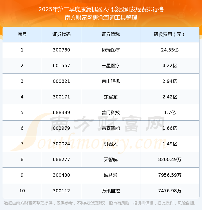 2025年第三季度,康復(fù)機(jī)器人概念股研發(fā)經(jīng)費(fèi)排行榜中,邁瑞醫(yī)療(300760)研發(fā)經(jīng)費(fèi)總額高達(dá)24.35億,三星醫(yī)療(601567)和京山輕機(jī)(000821)位居第二和第三,東富龍(300171)、普門科技(688389)、雷賽智能(002979)、機(jī)器人(300024)、天智航(688277)、誠(chéng)益通(300430)、萬(wàn)訊自控(300112)進(jìn)入前十,研發(fā)經(jīng)費(fèi)總額分別排名第4-10名。