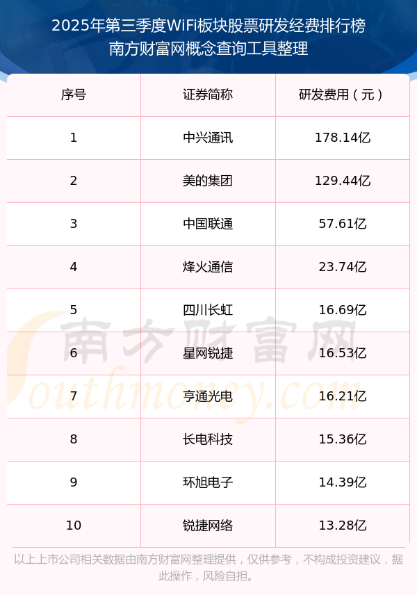 2025年第三季度,WiFi板塊股票研發(fā)經(jīng)費(fèi)排行榜中,中興通訊(000063)研發(fā)經(jīng)費(fèi)總額高達(dá)178.14億,美的集團(tuán)(000333)和中國聯(lián)通(600050)位居第二和第三,烽火通信(600498)、四川長虹(600839)、星網(wǎng)銳捷(002396)、亨通光電(600487)、長電科技(600584)、環(huán)旭電子(601231)、銳捷網(wǎng)絡(luò)(301165)進(jìn)入前十,研發(fā)經(jīng)費(fèi)總額分別排名第4-10名。