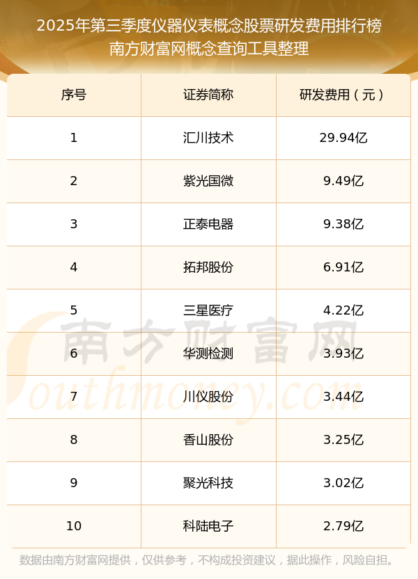 2025年第三季度,儀器儀表概念股票研發(fā)費用排名如下:匯川技術(shù)(300124)研發(fā)費用總額高達29.94億,紫光國微(002049)和正泰電器(601877)分別位居第二和第三,拓邦股份(002139)、三星醫(yī)療(601567)、華測檢測(300012)、川儀股份(603100)、香山股份(002870)、聚光科技(300203)、科陸電子(002121)分別進入前十,其研發(fā)費用總額分別排名第4-10名。