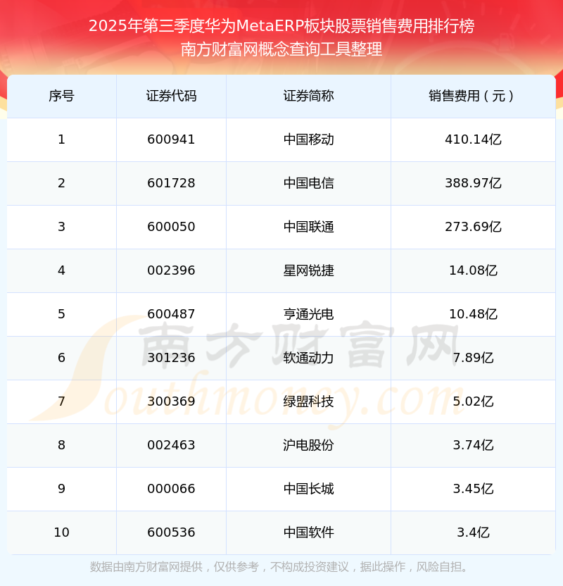 2025年第三季度,華為MetaERP板塊股票銷售費(fèi)用排名中,中國(guó)移動(dòng)(600941)銷售費(fèi)用總額高達(dá)410.14億,中國(guó)電信(601728)和中國(guó)聯(lián)通(600050)排名第二和第三,星網(wǎng)銳捷(002396)、亨通光電(600487)、軟通動(dòng)力(301236)、綠盟科技(300369)、滬電股份(002463)、中國(guó)長(zhǎng)城(000066)、中國(guó)軟件(600536)進(jìn)入前十,銷售費(fèi)用總額分別排名第4-10名。