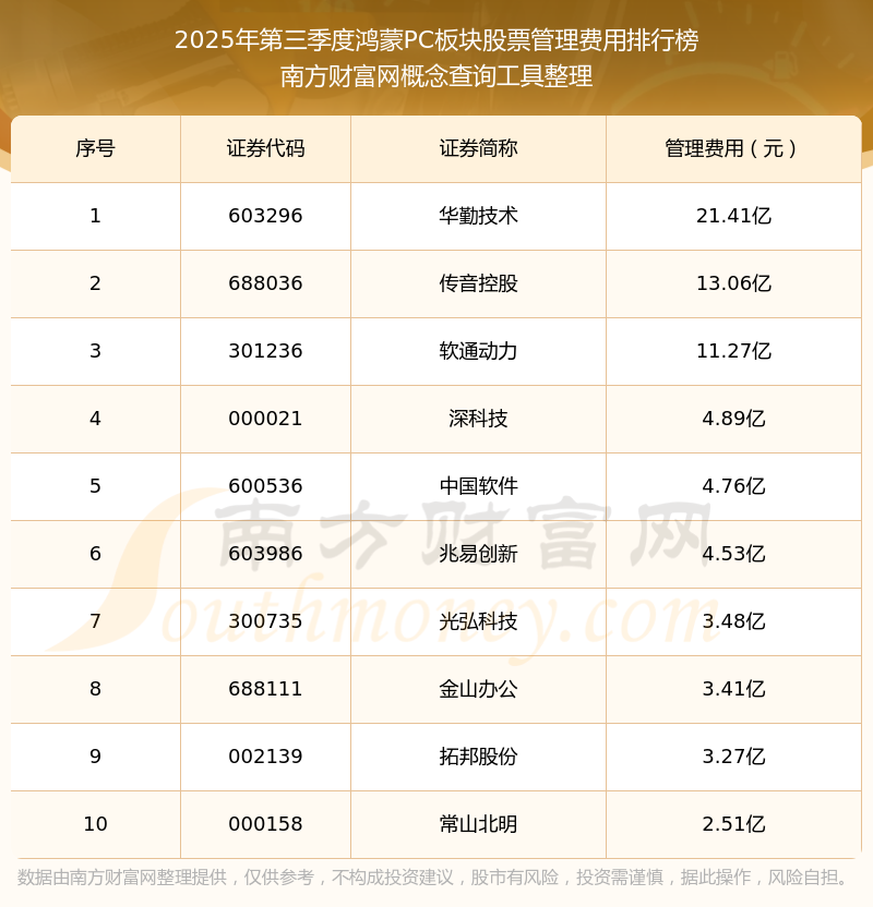 2025年第三季度,鴻蒙PC板塊股票管理費(fèi)用排行榜如下:華勤技術(shù)(603296)的管理費(fèi)用總額高達(dá)21.41億,傳音控股(688036)和軟通動(dòng)力(301236)分別排名第二和第三,深科技(000021)、中國(guó)軟件(600536)、兆易創(chuàng)新(603986)、光弘科技(300735)、金山辦公(688111)、拓邦股份(002139)、常山北明(000158)分別進(jìn)入前十,其管理費(fèi)用總額分別排名第4-10名。