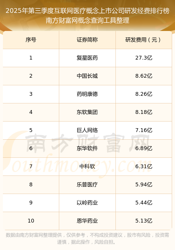 2025年第三季度互聯(lián)網(wǎng)醫(yī)療概念上市公司研發(fā)經(jīng)費排行榜如下:復(fù)星醫(yī)藥(600196)研發(fā)經(jīng)費總額高達(dá)27.3億,中國長城(000066)和藥明康德(603259)分別排名第二和第三,東軟集團(600718)、巨人網(wǎng)絡(luò)(002558)、東華軟件(002065)、中科軟(603927)、樂普醫(yī)療(300003)、以嶺藥業(yè)(002603)、恩華藥業(yè)(002262)分別進(jìn)入前十,其研發(fā)經(jīng)費總額分別排名第4-10名。