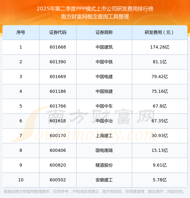2025年第二季度PPP模式上市公司研發(fā)費用排行榜如下:中國建筑(601668)研發(fā)費用總額高達174.26億,中國中鐵(601390)和中國電建(601669)分別排名第二和第三,中國鐵建(601186)、中國中車(601766)、中國中冶(601618)、上海建工(600170)、國電南瑞(600406)、隧道股份(600820)、安徽建工(600502)分別進入前十,其研發(fā)費用總額分別排名第4-10名。