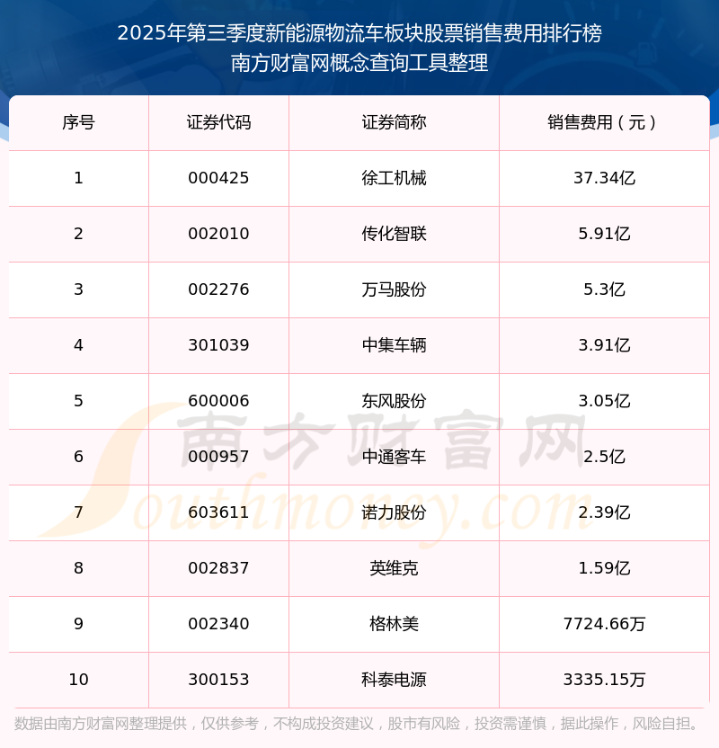 2025年第三季度新能源物流車板塊股票銷售費用排行榜如下:徐工機械(000425)的銷售費用總額高達37.34億,傳化智聯(lián)(002010)和萬馬股份(002276)分別位居第二和第三,中集車輛(301039)、東風股份(600006)、中通客車(000957)、諾力股份(603611)、英維克(002837)、格林美(002340)、科泰電源(300153)分別進入前十,其銷售費用總額分別排名第4-10名。
