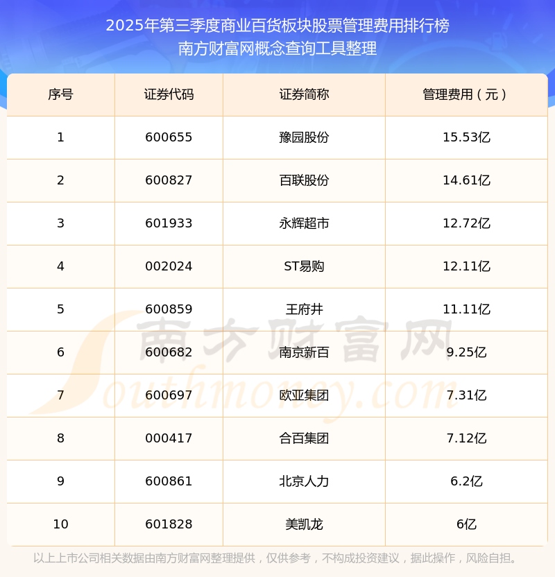 2025年第三季度,商業(yè)百貨板塊股票管理費(fèi)用排行榜如下:豫園股份(600655)的管理費(fèi)用總額高達(dá)15.53億,百聯(lián)股份(600827)和永輝超市(601933)分別排名第二和第三,ST易購(gòu)(002024)、王府井(600859)、南京新百(600682)、歐亞集團(tuán)(600697)、合百集團(tuán)(000417)、北京人力(600861)、美凱龍(601828)分別進(jìn)入前十,其管理費(fèi)用總額分別排名第4-10名。