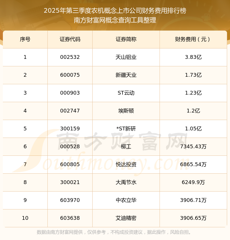 2025年第三季度,農(nóng)機概念上市公司財務(wù)費用排行榜中,天山鋁業(yè)(002532)財務(wù)費用總額高達3.83億,新疆天業(yè)(600075)和ST云動(000903)位居第二和第三,埃斯頓(002747)、*ST新研(300159)、柳工(000528)、悅達投資(600805)、大禹節(jié)水(300021)、中農(nóng)立華(603970)、艾迪精密(603638)進入前十,財務(wù)費用總額分別排名第4-10名。