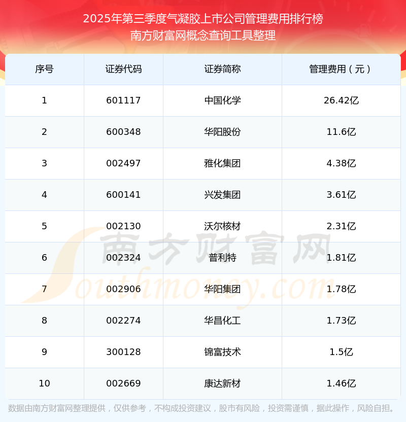 2025年第三季度,氣凝膠上市公司管理費(fèi)用排行榜如下:中國化學(xué)(601117)的管理費(fèi)用總額高達(dá)26.42億,華陽股份(600348)和雅化集團(tuán)(002497)分別排名第二和第三,興發(fā)集團(tuán)(600141)、沃爾核材(002130)、普利特(002324)、華陽集團(tuán)(002906)、華昌化工(002274)、錦富技術(shù)(300128)、康達(dá)新材(002669)分別進(jìn)入前十,其管理費(fèi)用總額分別排名第4-10名。